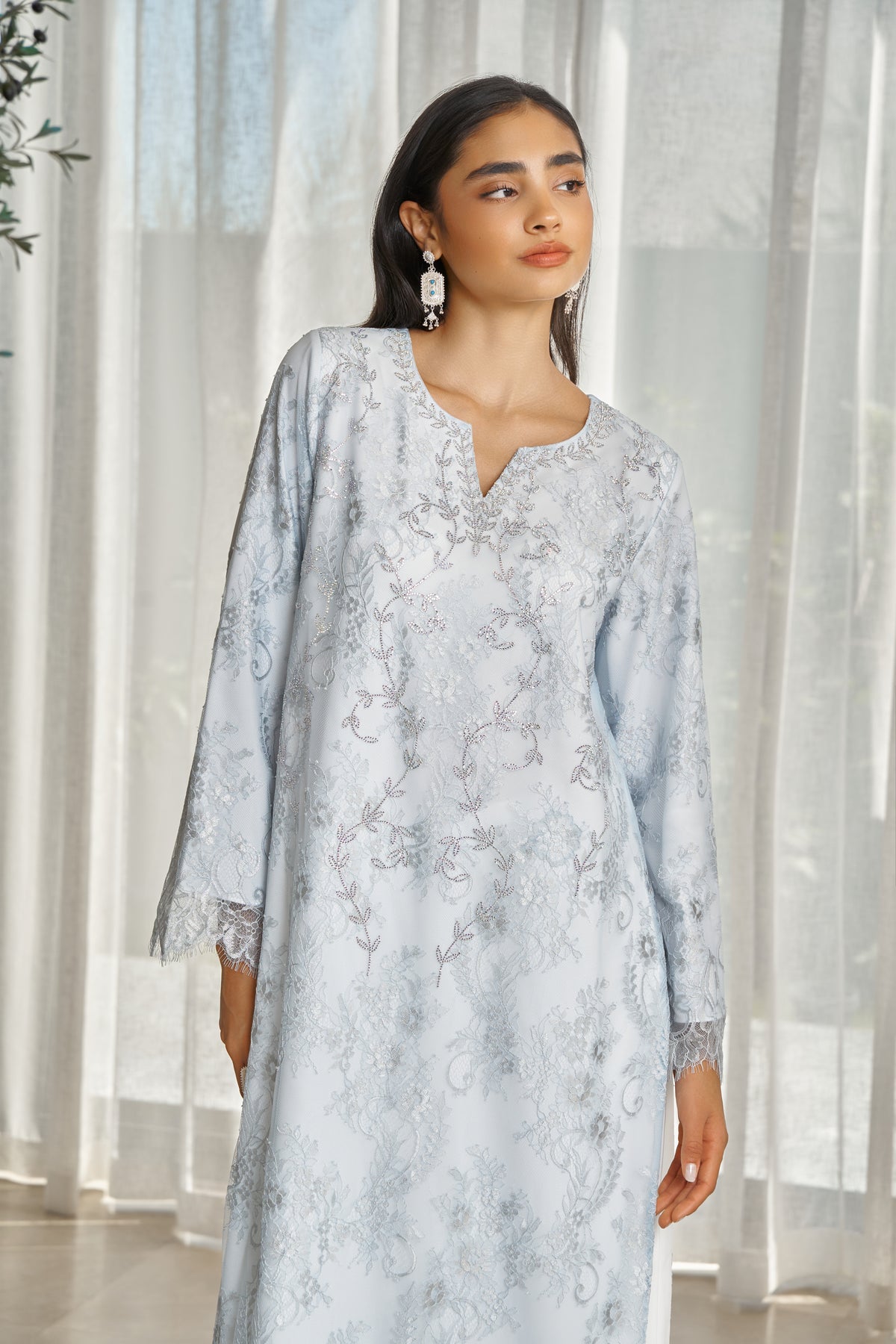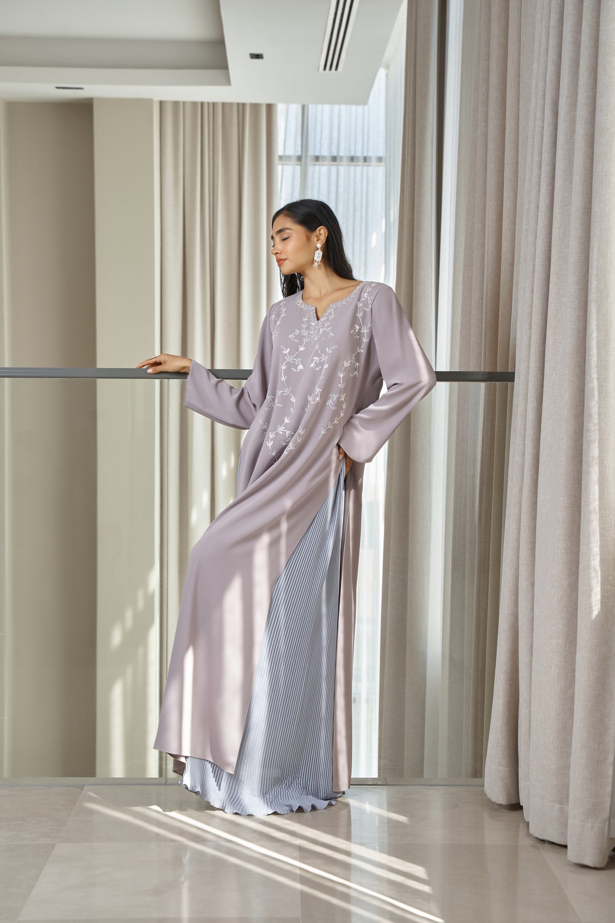 Silhouette: Long, flowing kaftan with elegant sleeves