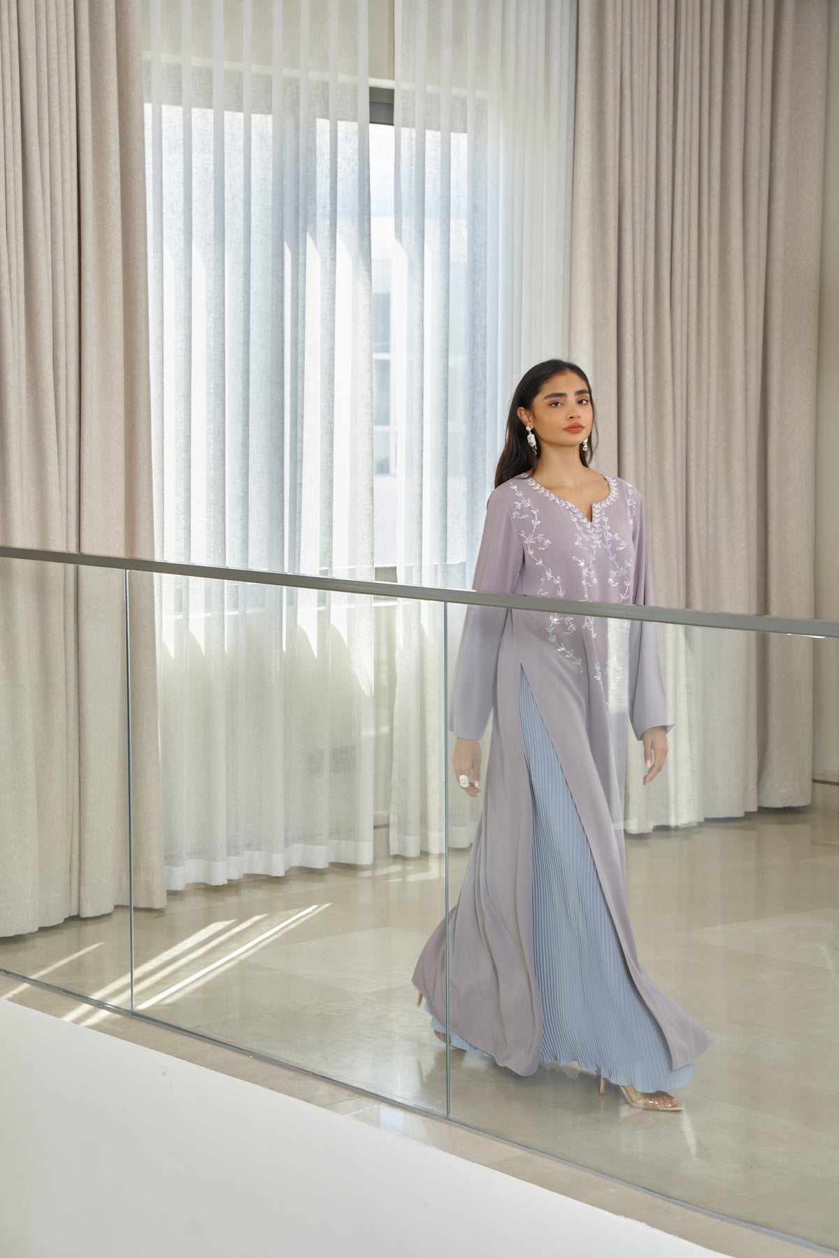 Design: 2-piece set including a long crystal-embellished kaftan and a flowing pleated skirt