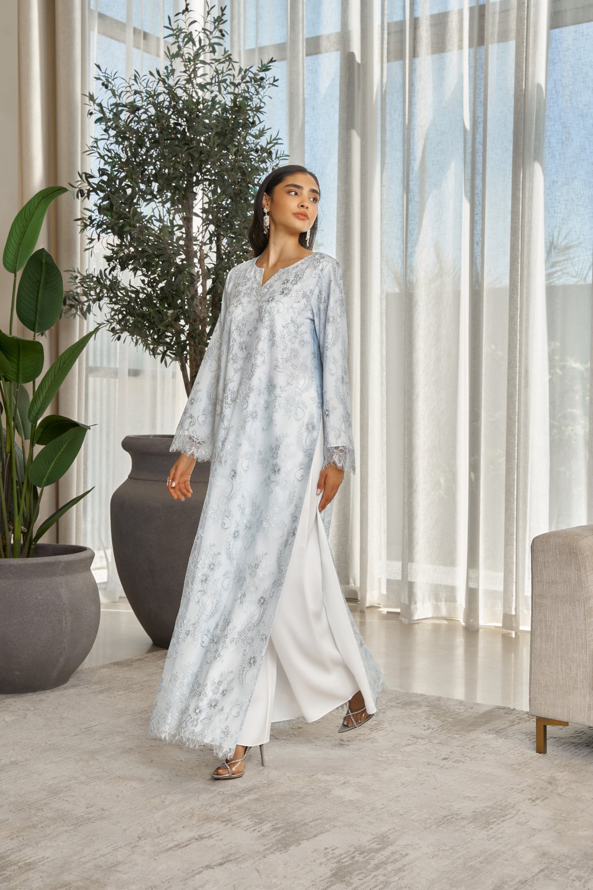 Design: Contemporary caftan with a signature By Almuna twist, featuring a sleek and flowing silhouette in a soft sky blue shade.