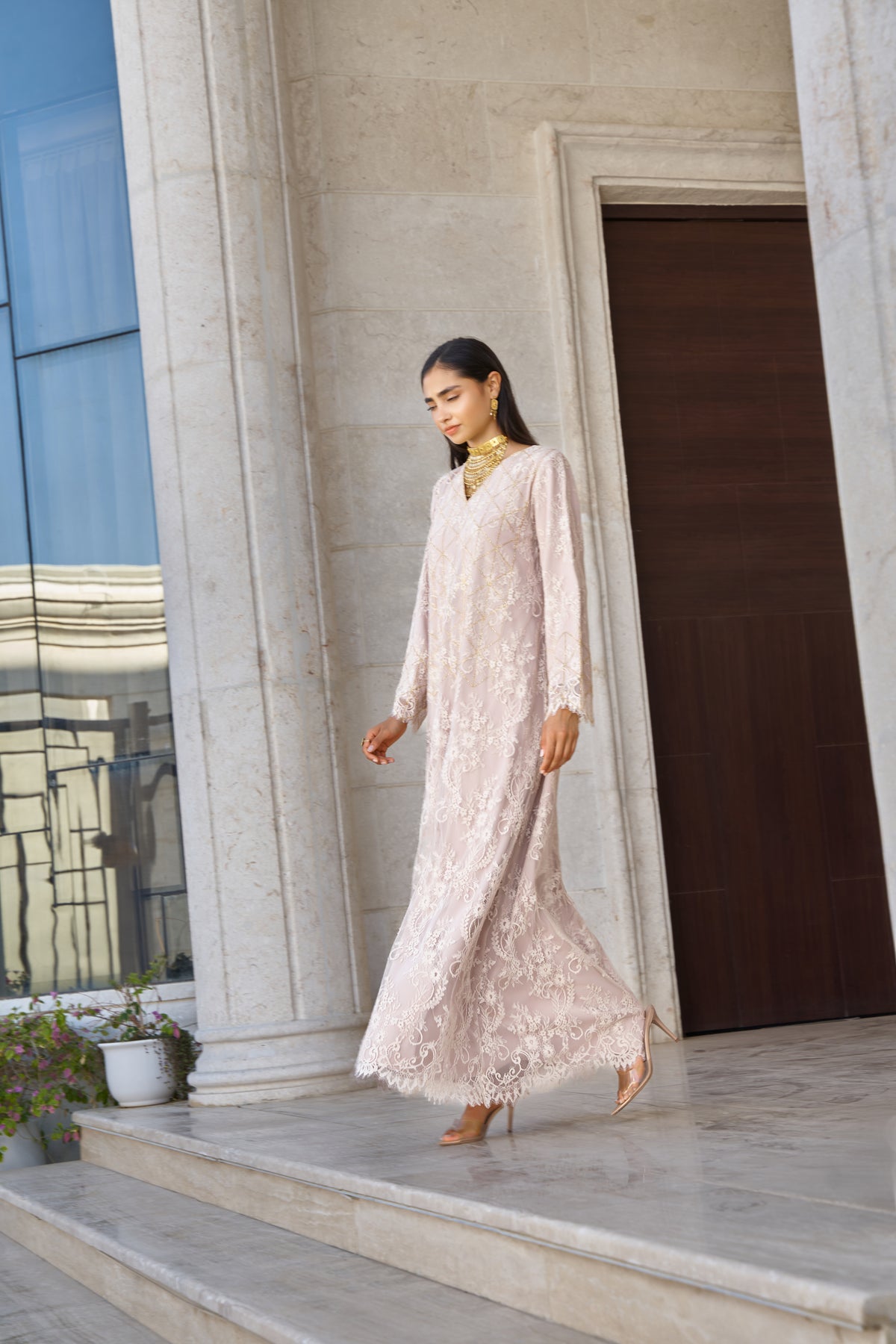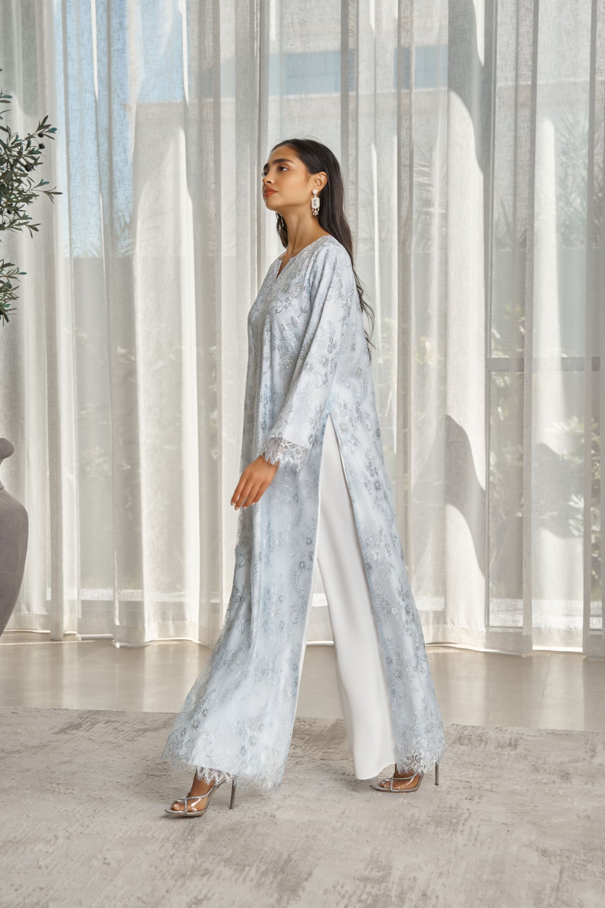 Design: Two-piece set featuring a lace kaftan paired with a pleated skirt