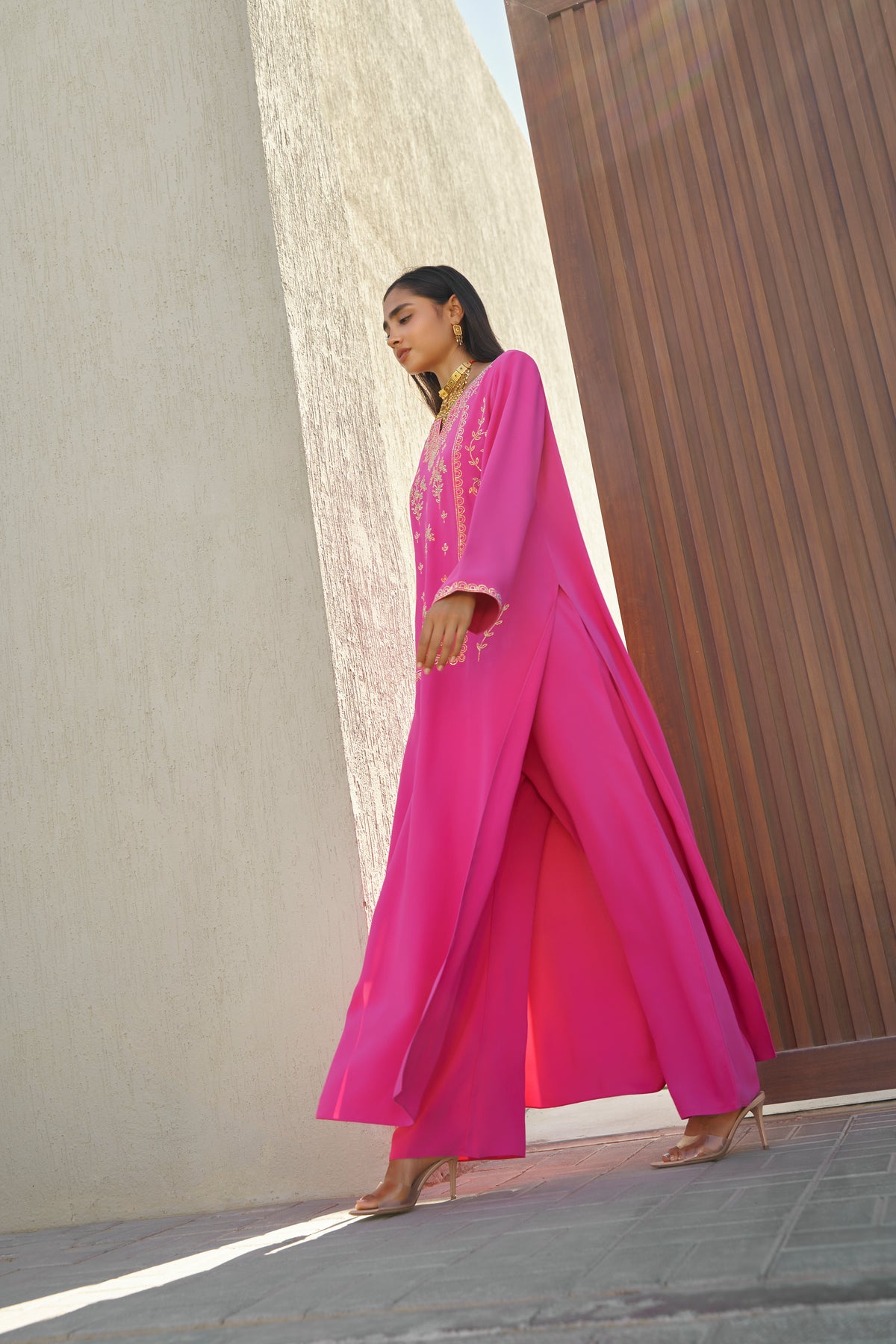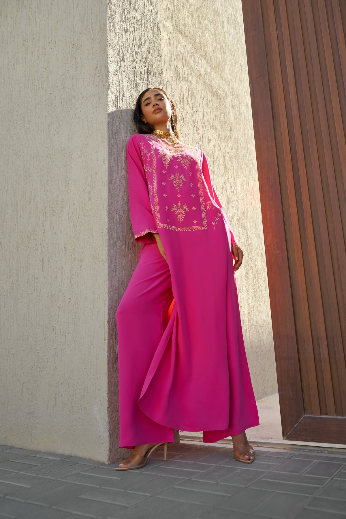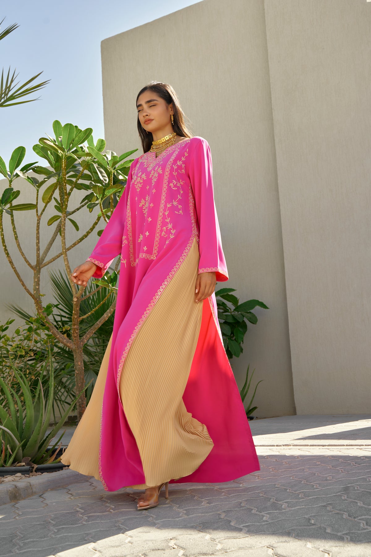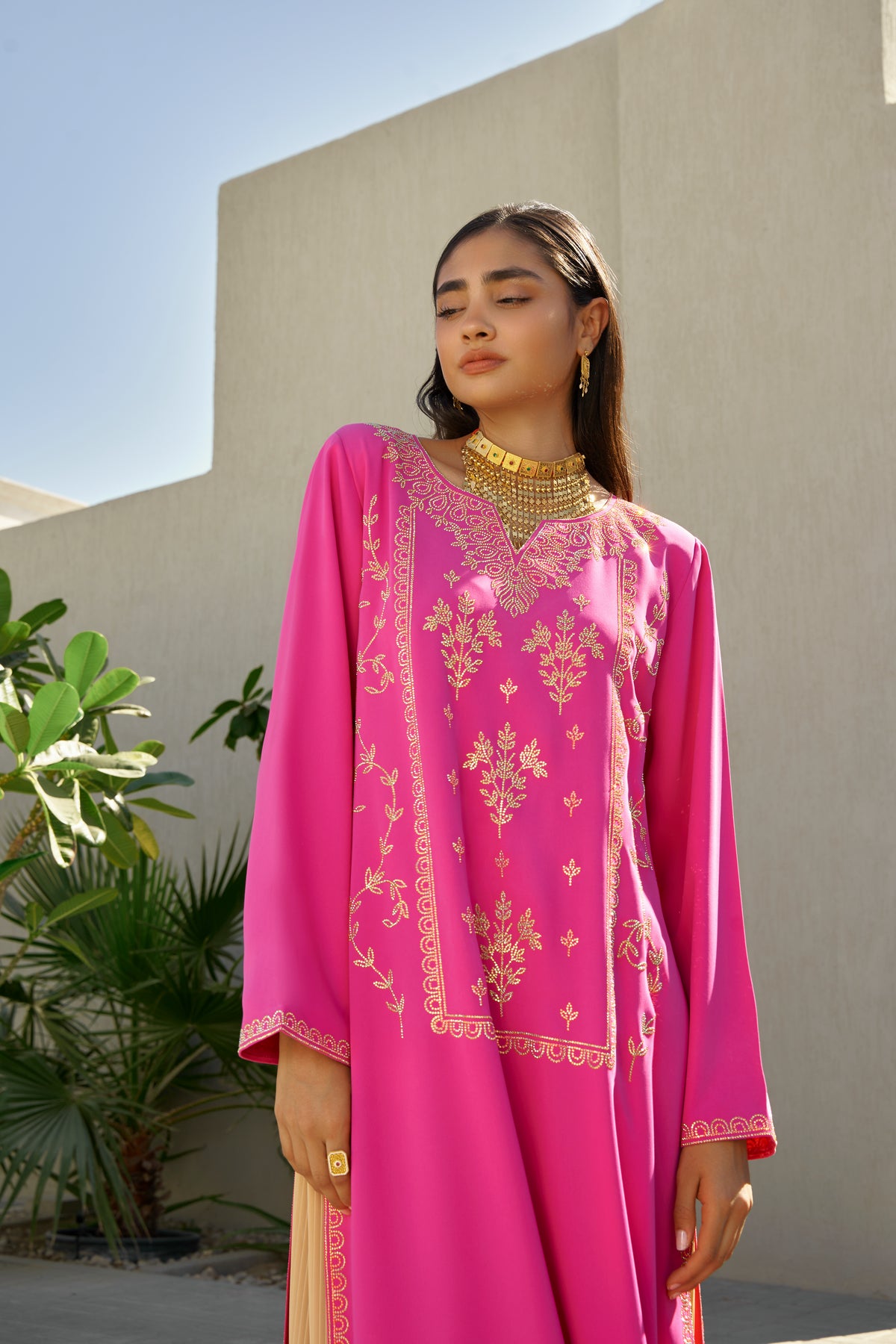 This vibrant fuchsia pink kaftan set blends bold color with refined craftsmanship. Made from premium medium-weight crepe, the ensemble features exquisite crystal embellishment and a beautifully coordinated pleated skirt, creating a striking yet elegant silhouette.