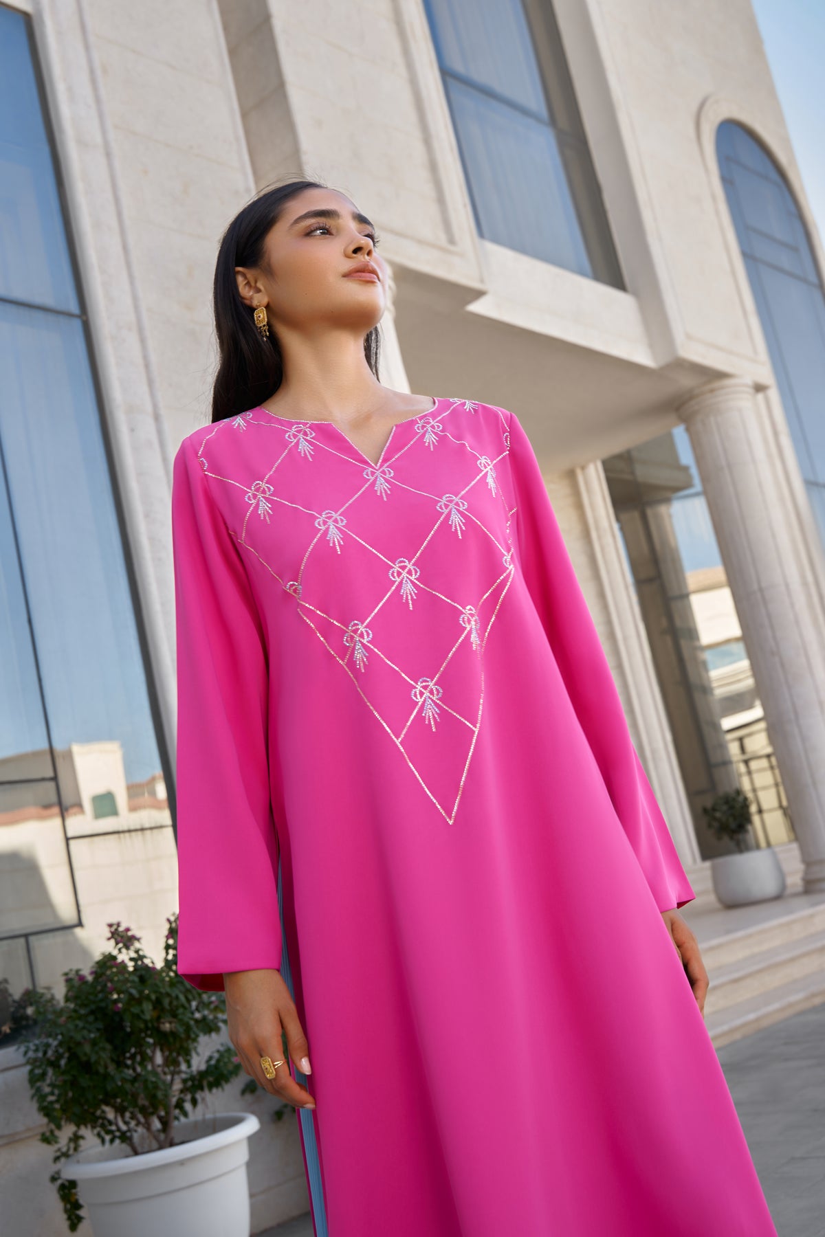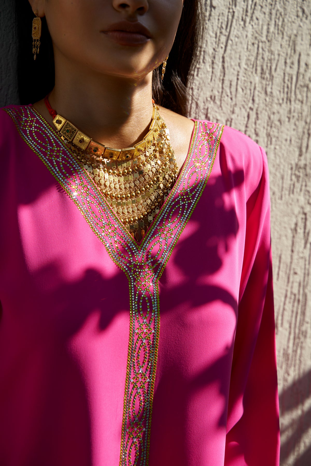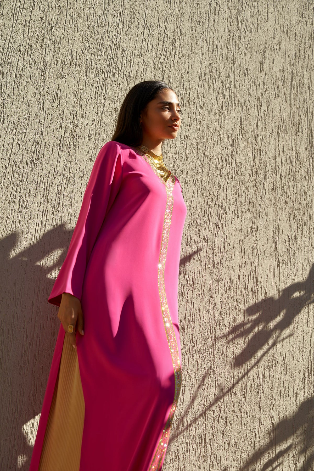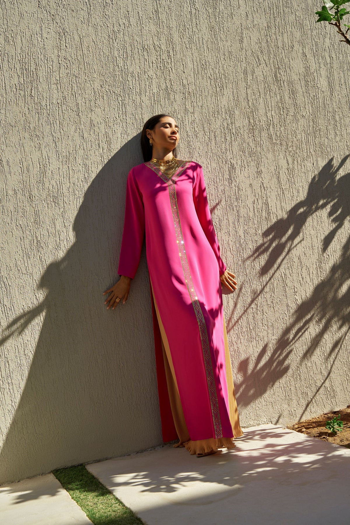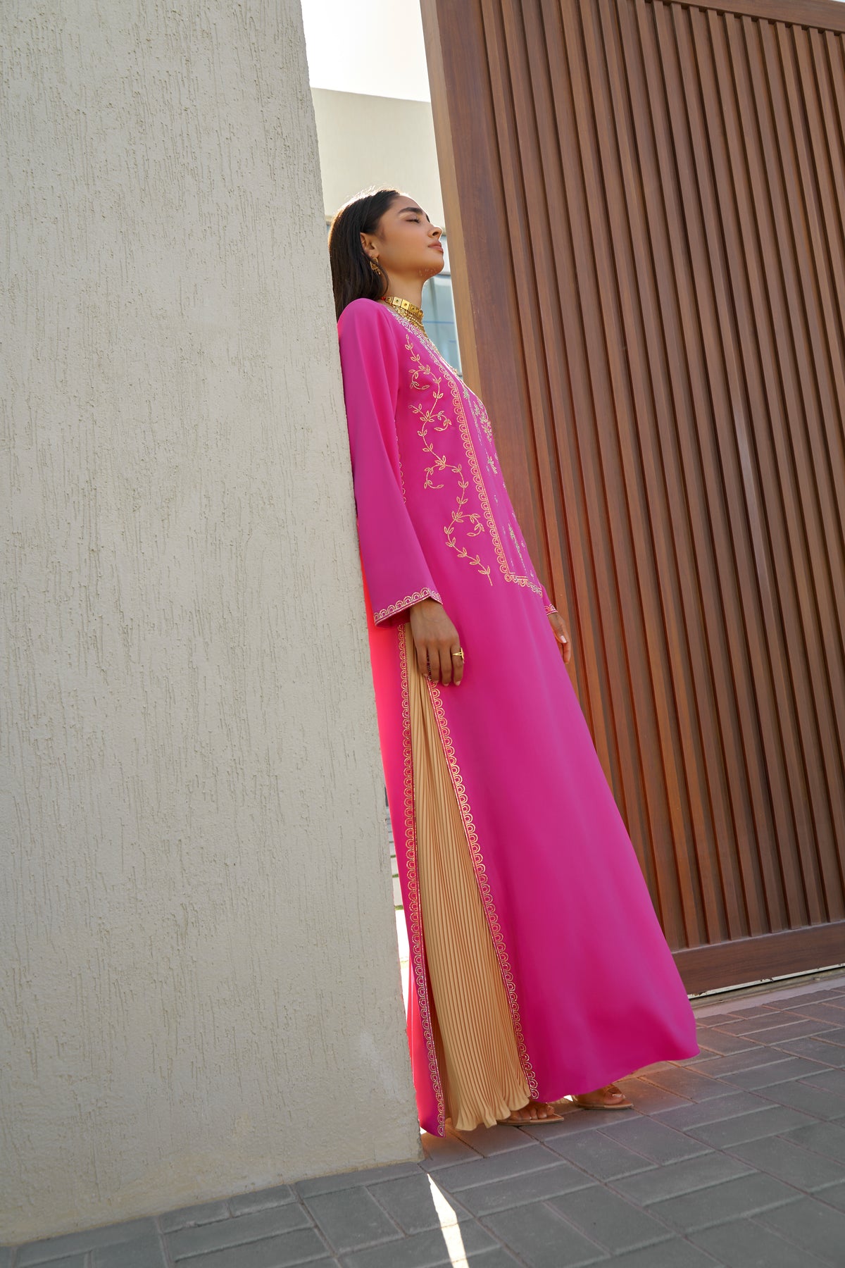 This vibrant fuchsia pink kaftan set blends bold color with refined craftsmanship. Made from premium medium-weight crepe, the ensemble features exquisite crystal embellishment and a beautifully coordinated pleated skirt, creating a striking yet elegant silhouette.