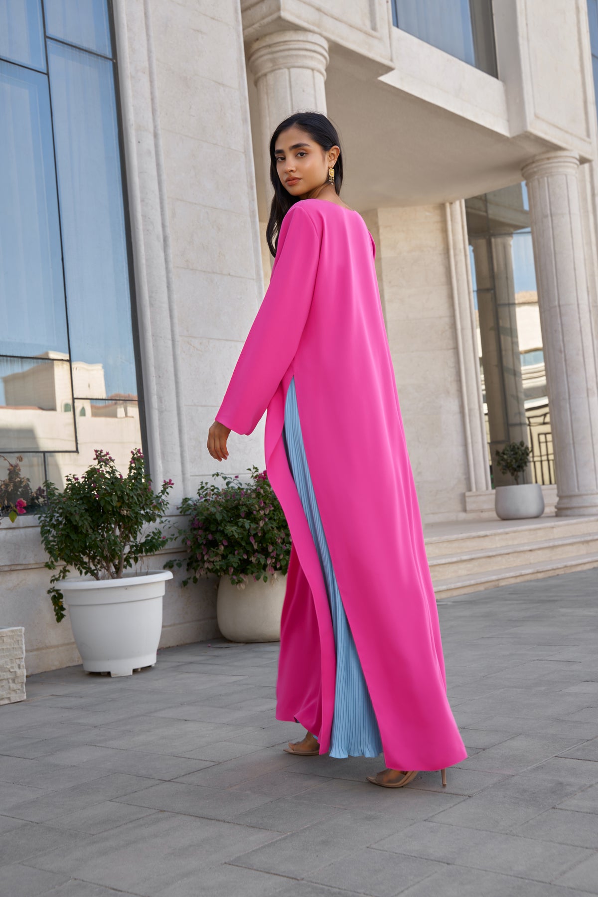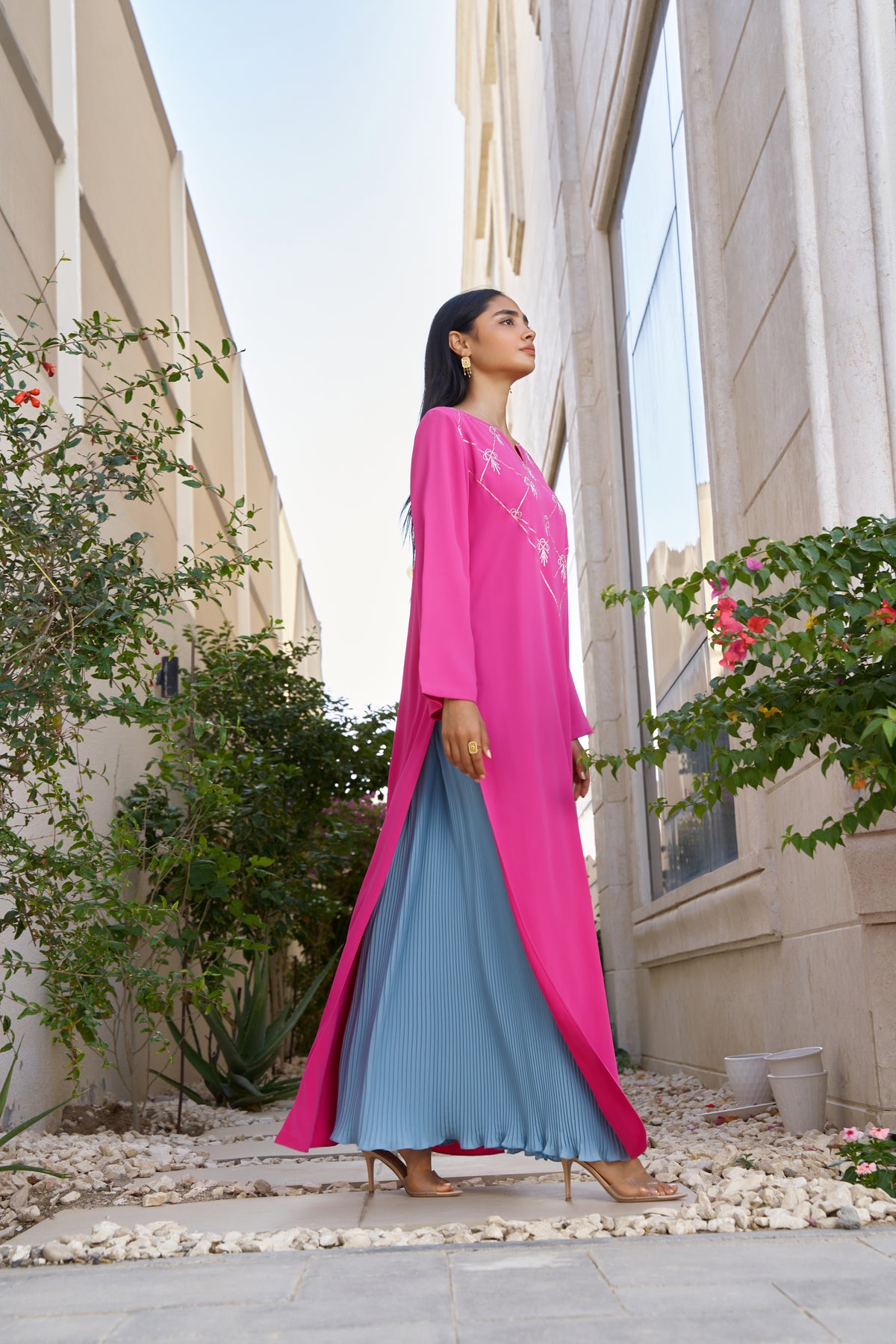 Color: Fuchsia Pink kaftan with a light blue pleated skirt