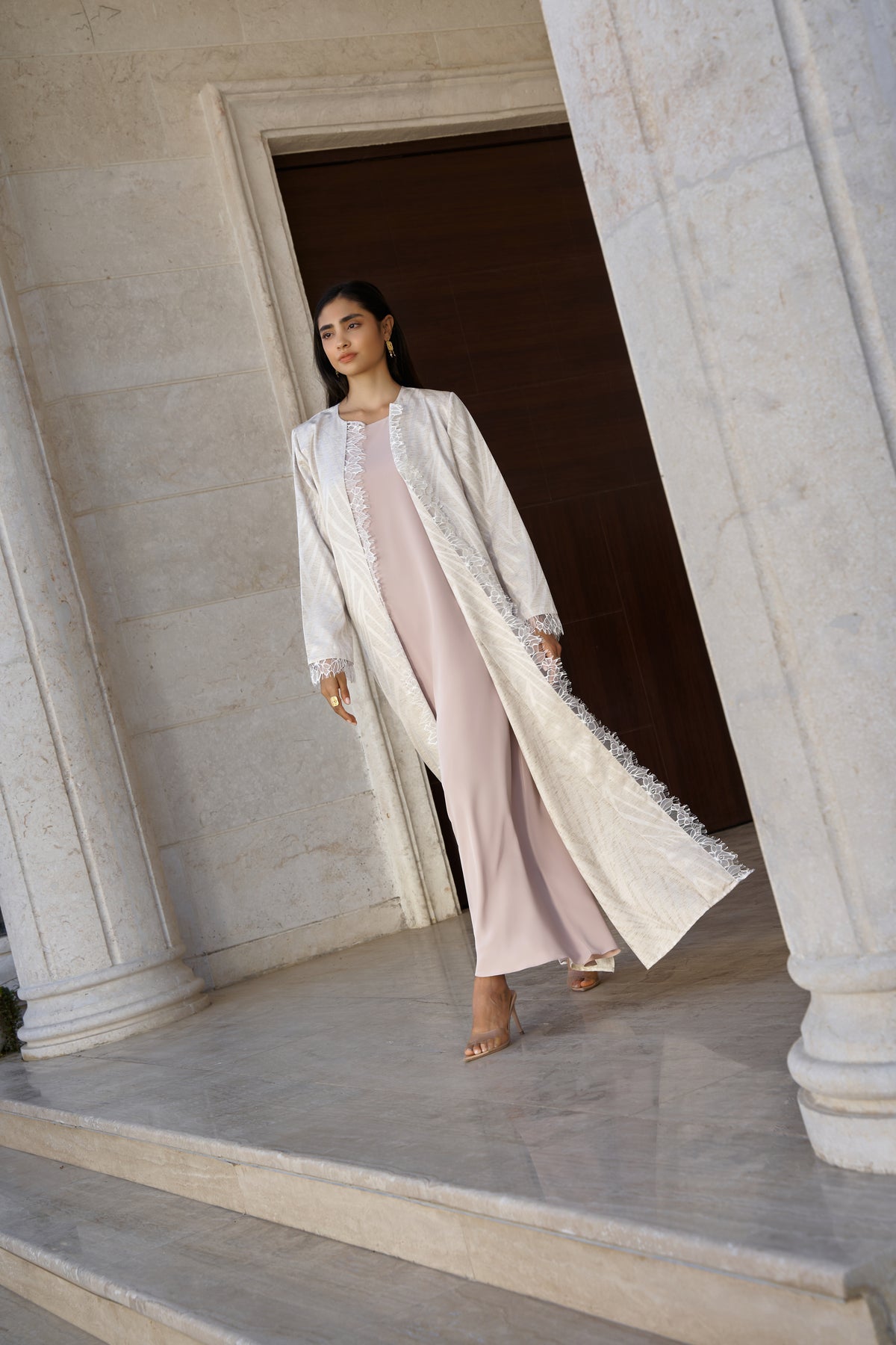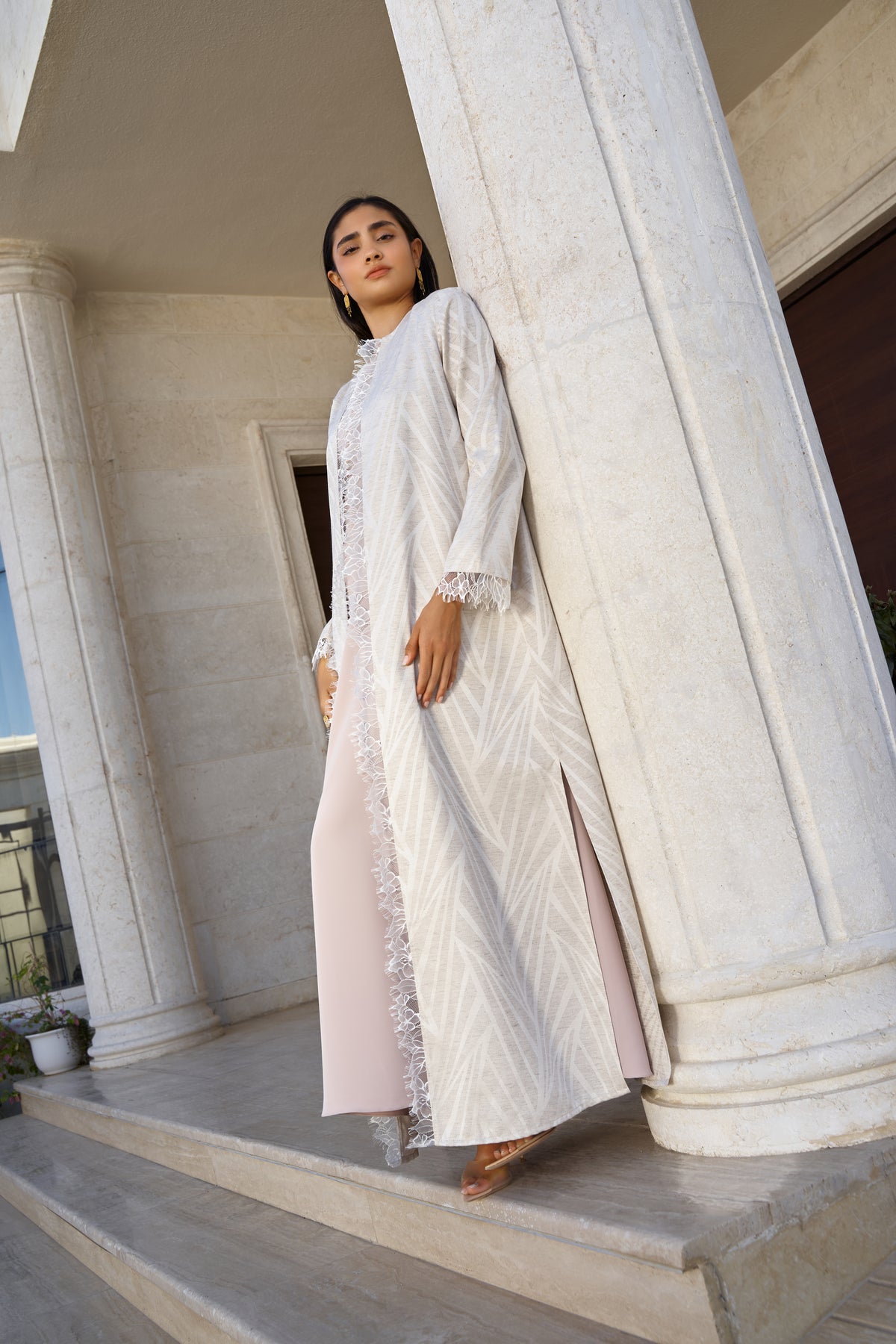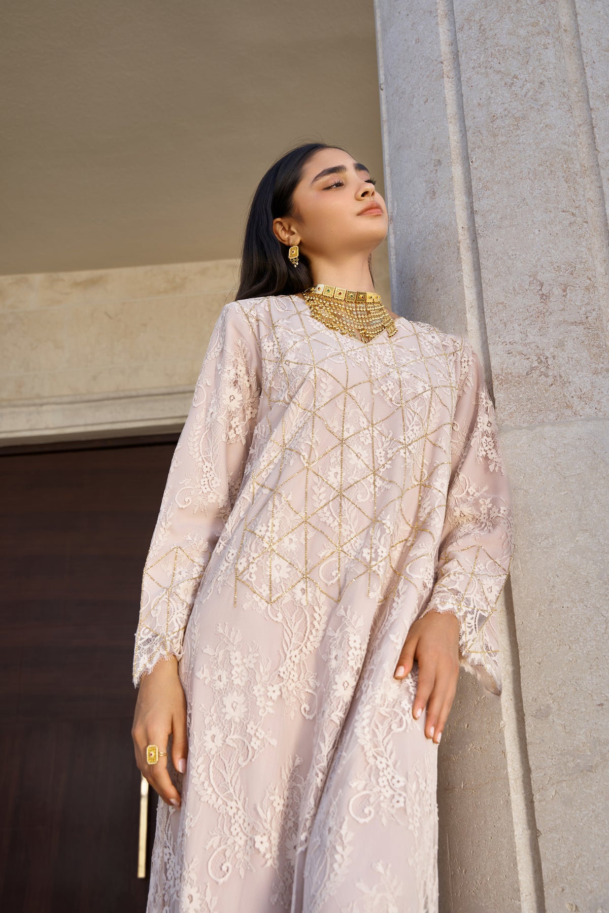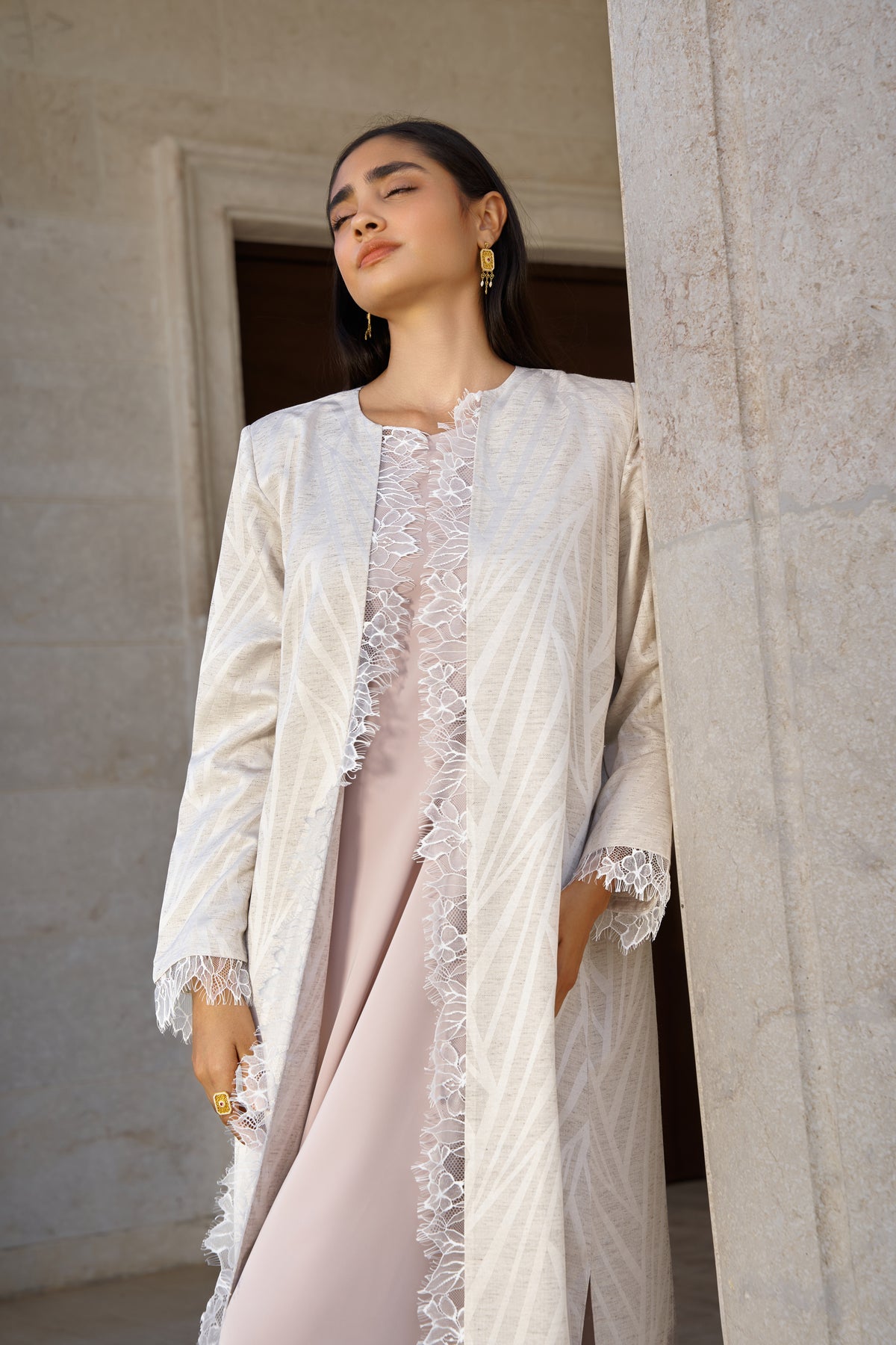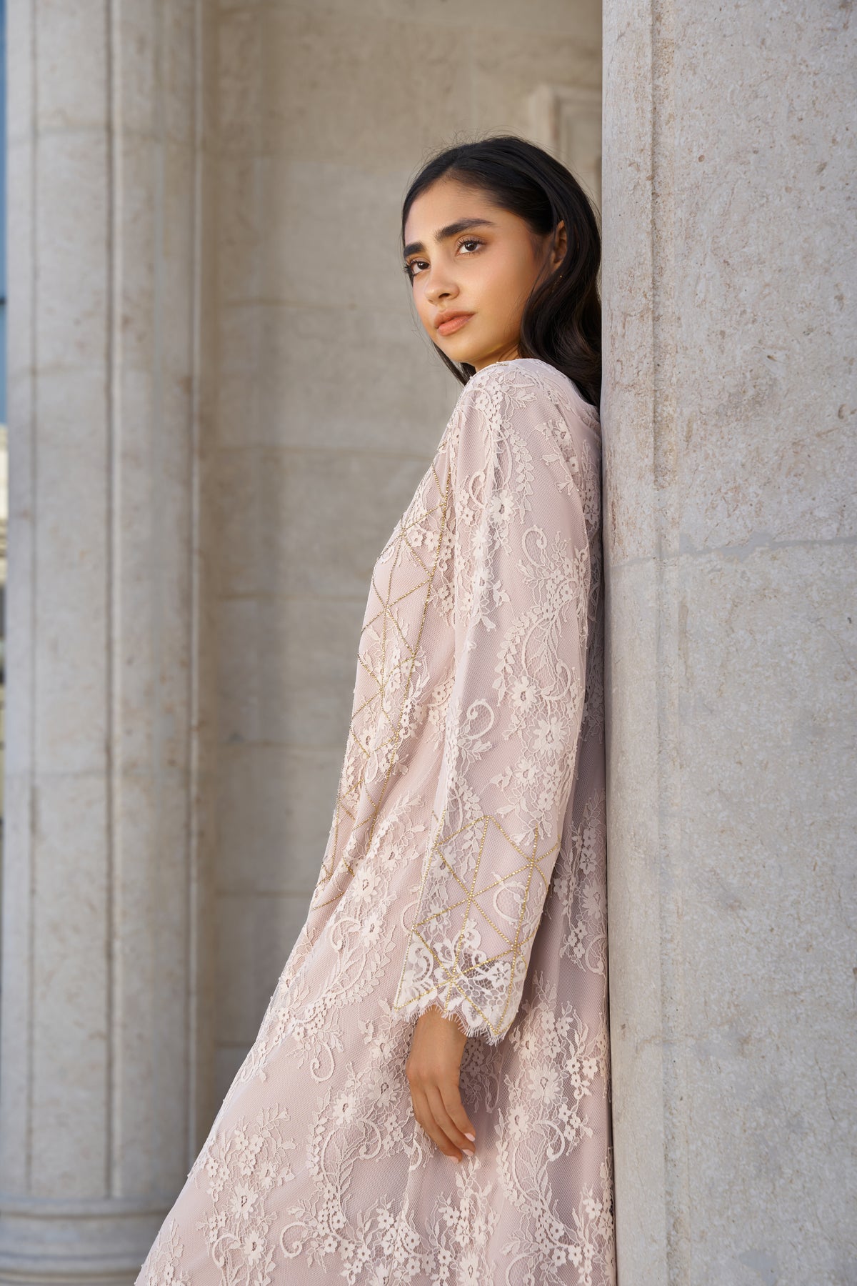 This elegant beige kaftan set combines timeless lace artistry with a flowing, modest silhouette.